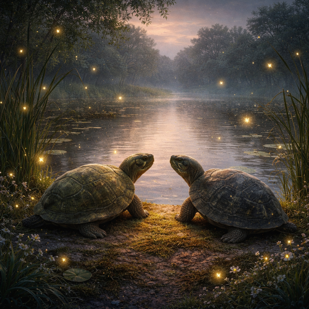 In a valley where the grass folded itself softly around small hills, there lived a moss-colored turtle named Elwin. Elwin had known the valley since his shell was new and smooth, since mornings arrived like slow sighs and evenings settled in with warm stars. He moved carefully through his days, noticing small things: the way dew clung to clover, the patient drifting of clouds, the quiet comfort of familiar paths.