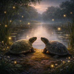 In a valley where the grass folded itself softly around small hills, there lived a moss-colored turtle named Elwin. Elwin had known the valley since