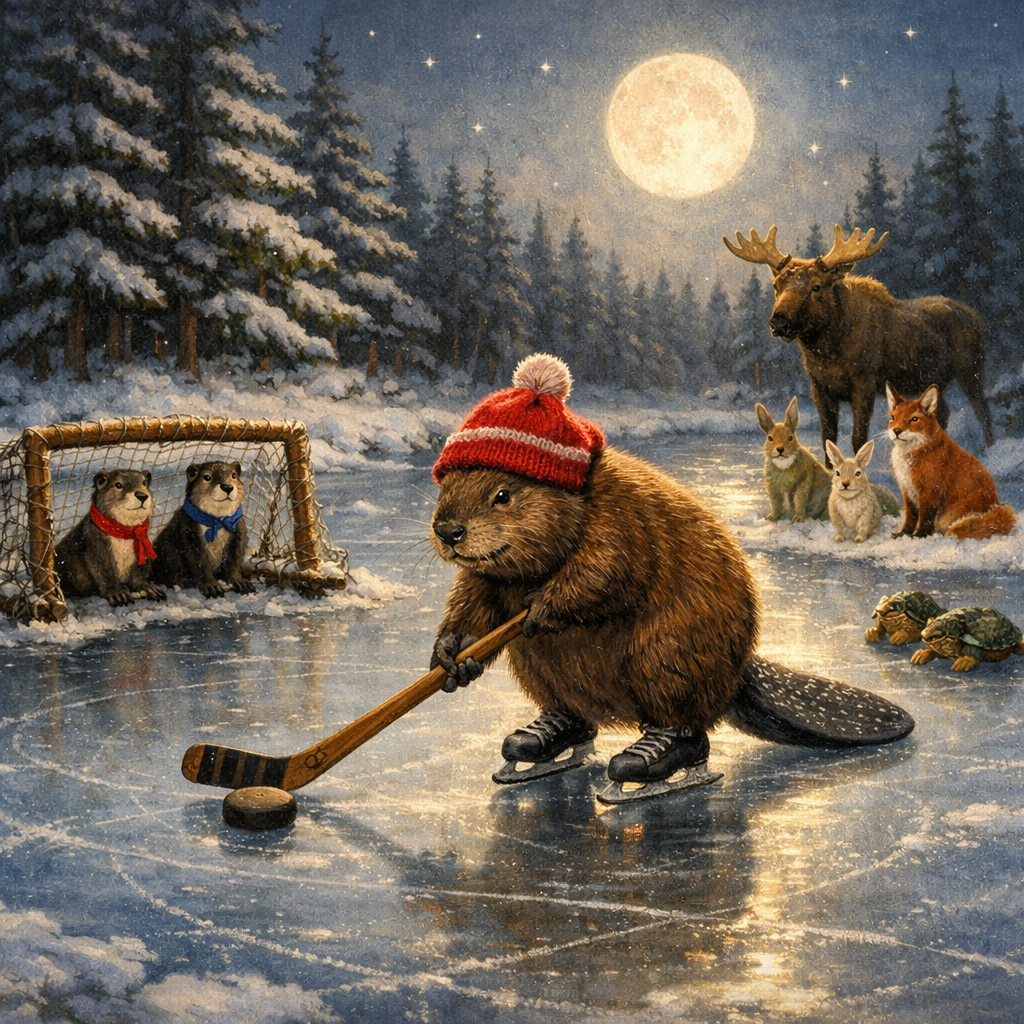 Oliver was a careful, steady beaver with warm brown fur and a tail that made tidy ripples in summer and soft thumps in snow. Like other beavers, he was skilled at building and mending, but he carried a different sort of joy in his heart. When the pond froze solid and the stars came out early, Oliver loved to play ice hockey.